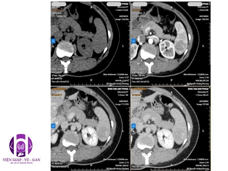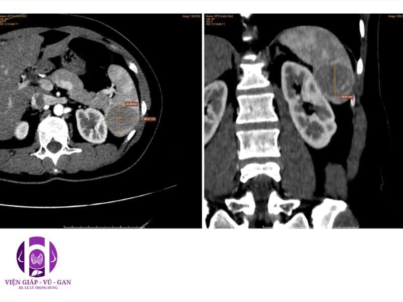 Lách: không to, tổn thương choán chỗ nhu mô cực dưới, giới hạn rõ, kích thước # 41x33x34mm, giảm nhẹ đậm độ trước tiêm, sau tiêm thuốc cản quang tổn thương bắt thuốc dạng chấm – nốt ở thì động mạch, lấp dần ở thì tĩnh mạch và thì muộn. Vỏ bao lách còn nguyên vẹn, không thâm nhiễm mỡ hay tụ dịch xung quanh.