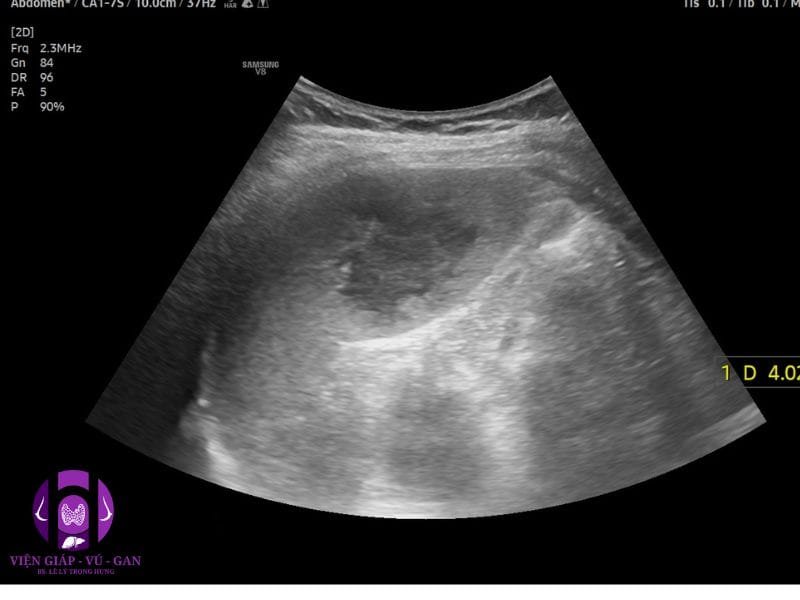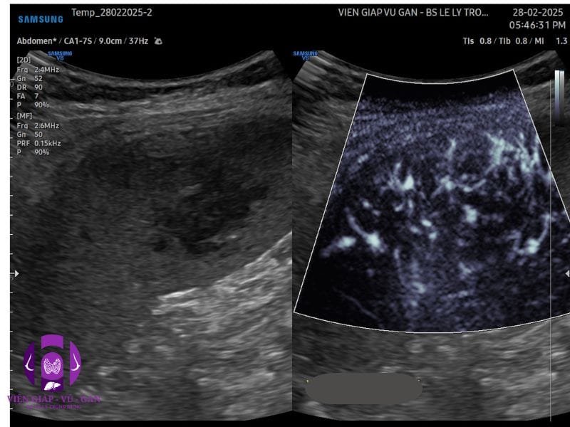 Lách: không to, cực dưới có khối echo dày, không đồng nhất, bờ đều, giới hạn rõ, kt# 40x30x25mm, doppler ghi nhận mạch máu phân bố rải rác ngoại vi và trung tâm.