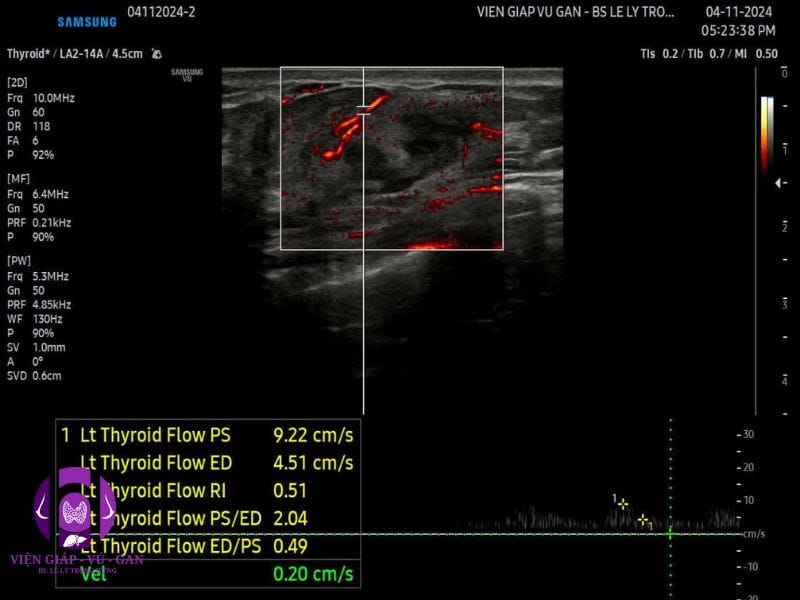 - Vú trái: vị trí 7 g cách núm vú 3 cm có khối đặc,echo kém, không đồng nhất, hình bầu dục, bờ đều, giới hạn rõ, không vôi, kích thước 23x20x10mm . Doppler: mạch máu phân bố dạng vòng , V = 9cm/s, RI =0,5. SWE = 19kPa.