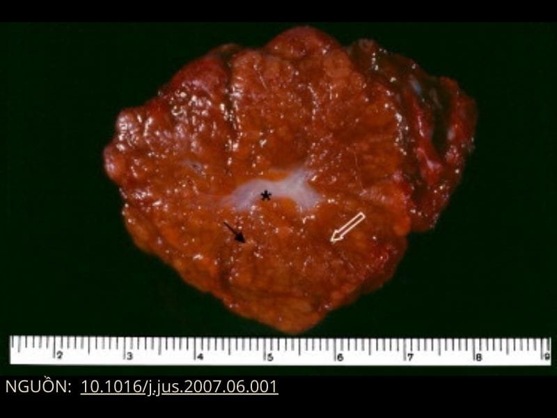 HÌNH 1: Đại thể của FNH – Các nốt màu vàng (mũi tên đen thẳng) được bao quanh bởi nhiều vách xơ (mũi tên trắng) và một vết sẹo trung tâm (*) .